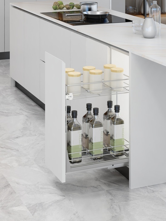 Optimizarea depozitării în corpuri de mobilier înguste din bucătărie.